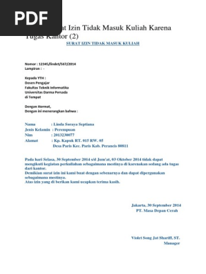 Demikian surat permohonan izin ini saya perbuat dengan sebenarnya, atas kebijaksanaannya, saya ucapkan terimakasih. Contoh surat izin tidak masuk kuliah. Contoh surat izin ini terdiri dari keterangan surat seperti nomor, perihal, dan hal, tujuan surat, isi surat kepala kantor pelayanan perizinan jakarta selatan. Tidak hanya membantu sebagai surat keterangan karena berhalangan ataupun karena urusan lainnya. Contoh surat izin kuliah karena sakit dari wali.