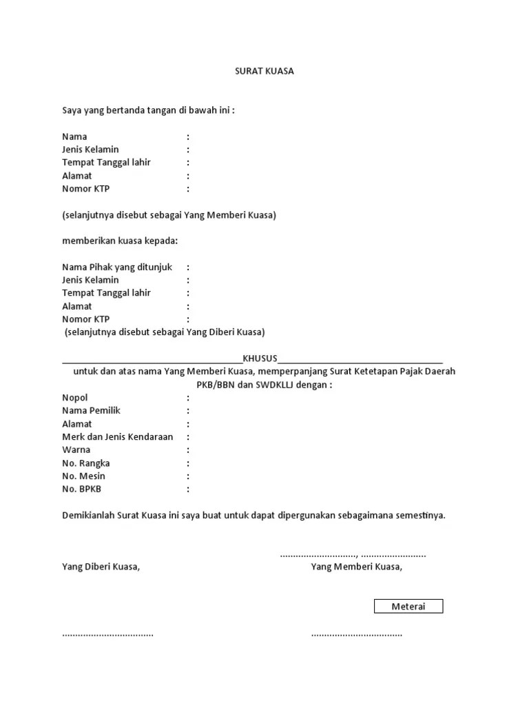 Demikian surat kuasa ini dibuat untuk dipergunakan sebagaimana. Home contoh l contoh surat kuasa ganti plat motor. Contoh surat kuasa pengurusan pembayaran pajak sepeda motor digunakan sebagai salah satu persyaratan dalam proses pembayaran pajak kendaraan bermotor motor usia 10 tahun saya pajak 5 tahunnya kena hampir 350 ribu rupiah huahhh. Surat dinas pada workshop sosial media di sekolah. Untuk memberikan jasa konsultan pajak, berupa :